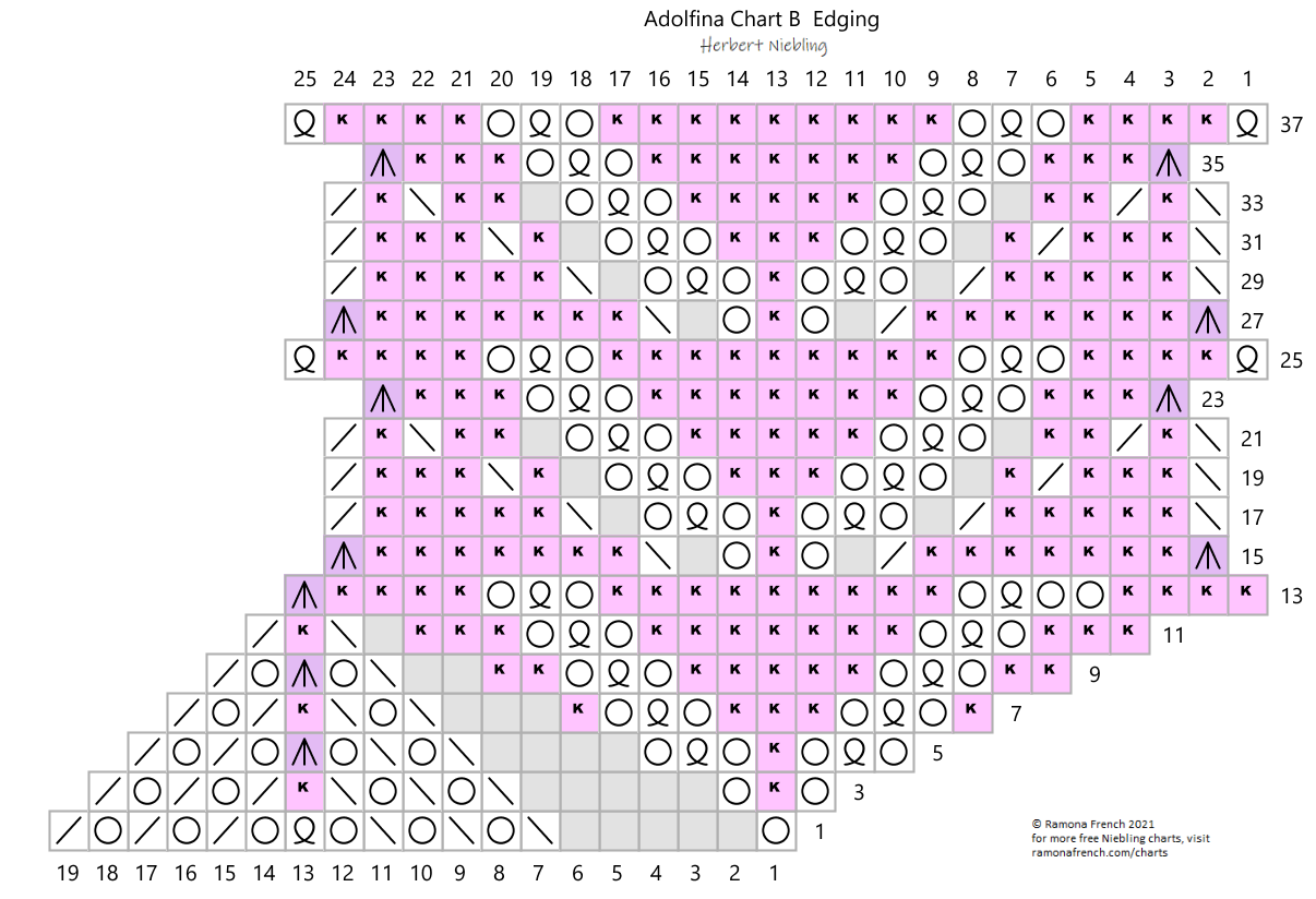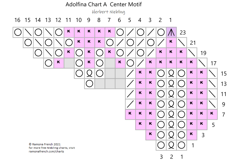 Center motif: Cast on 8 stitches and join into a round. Knit chart A, repeating the patterrn 8 times per round. Bind off loosely after the 24th round.