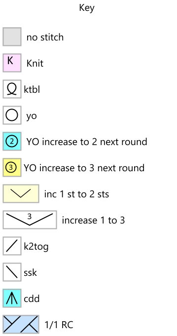 Cast on 10 stitches and join into a round. Repeat the pattern 10 times per round up to round 50. In round 8, increase the three yarnovers in round 7 to 8 stitches, alternating knit and purl stitches. From round 51 repeat the pattern 20 times per round. After round 144 use a crochet hook to crochet off the stitches. Crochet 3 stitches together with one single crochet and then chain 8. Repeat until all stitches have been bound off.