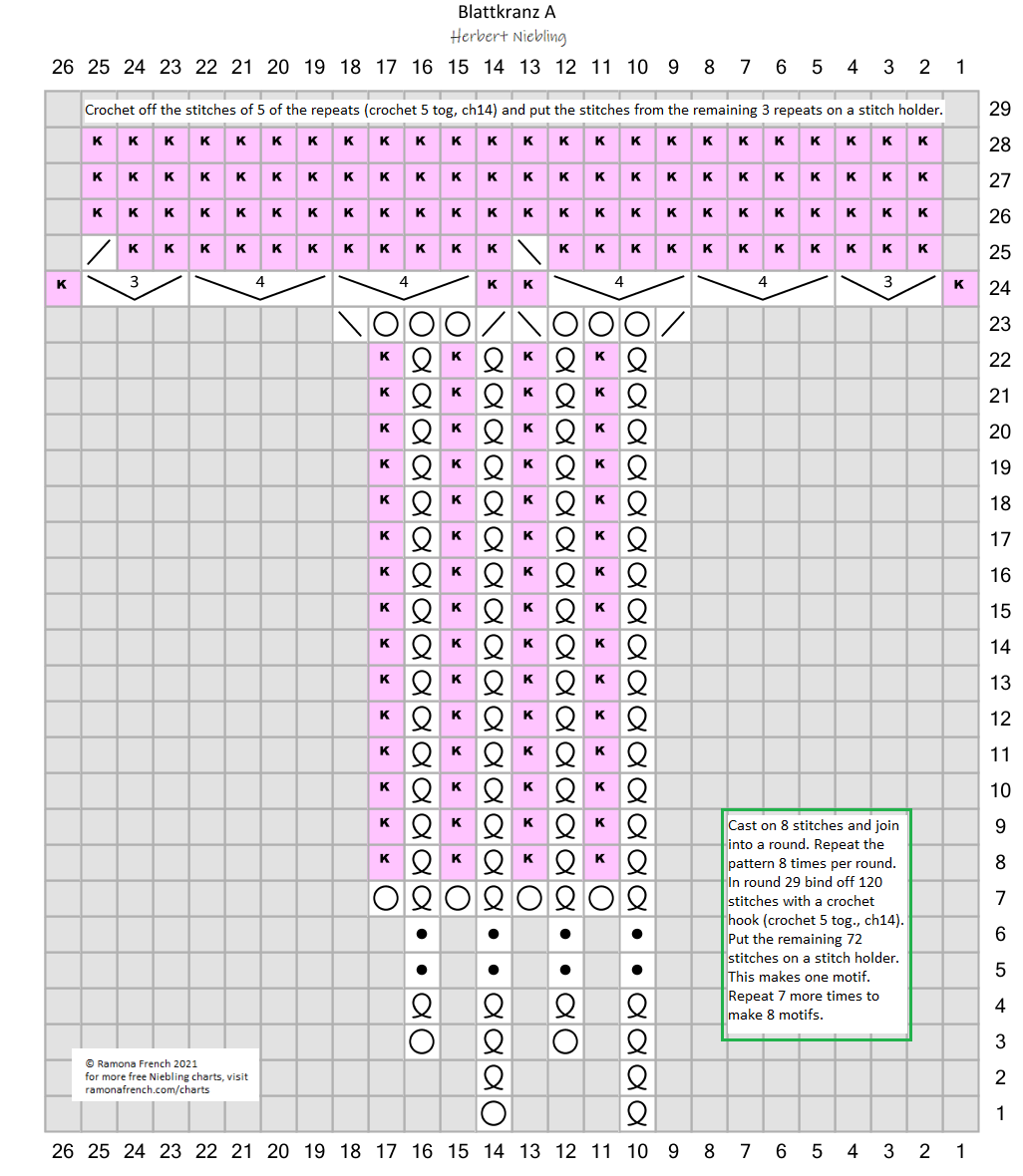 For each motif, cast on 8 stitches and knit chart A, repeating the pattern 8 times per round. In round 24 increase the 3 yarnovers to 11 stitches as shown. After round 28 bind off the stitches from 5 repeats with a crochet hook; decrease 5 stitches with a single crochet and chain 14 after each decrease. Place the remaining 72 stitches on a stitch holder or waste thread. Repeat until you have 8 motifs ready.