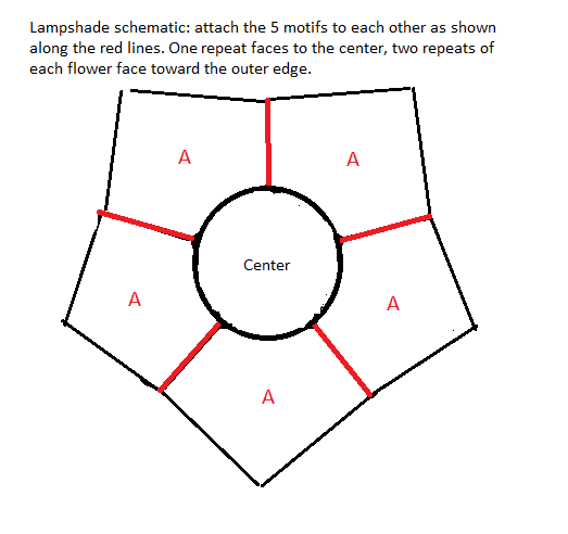 Join the 6 flower motifs into a wreath, grafting them together so that one repeat faces in toward the center, one repeat is attached to the next flower, two repeats face outward, and the final repeat is grafted to another flower. See the schematic chart.