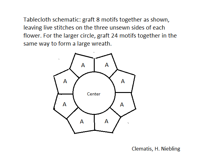 Tablecloth, approximately 130 cm in diameter. It consists of two rings of separately knitted flowers, sewn into a small and a large ring or wreath. Then work toward the center inside the small circle, then from the outer edge of the small ring to the larger ring of flowers.