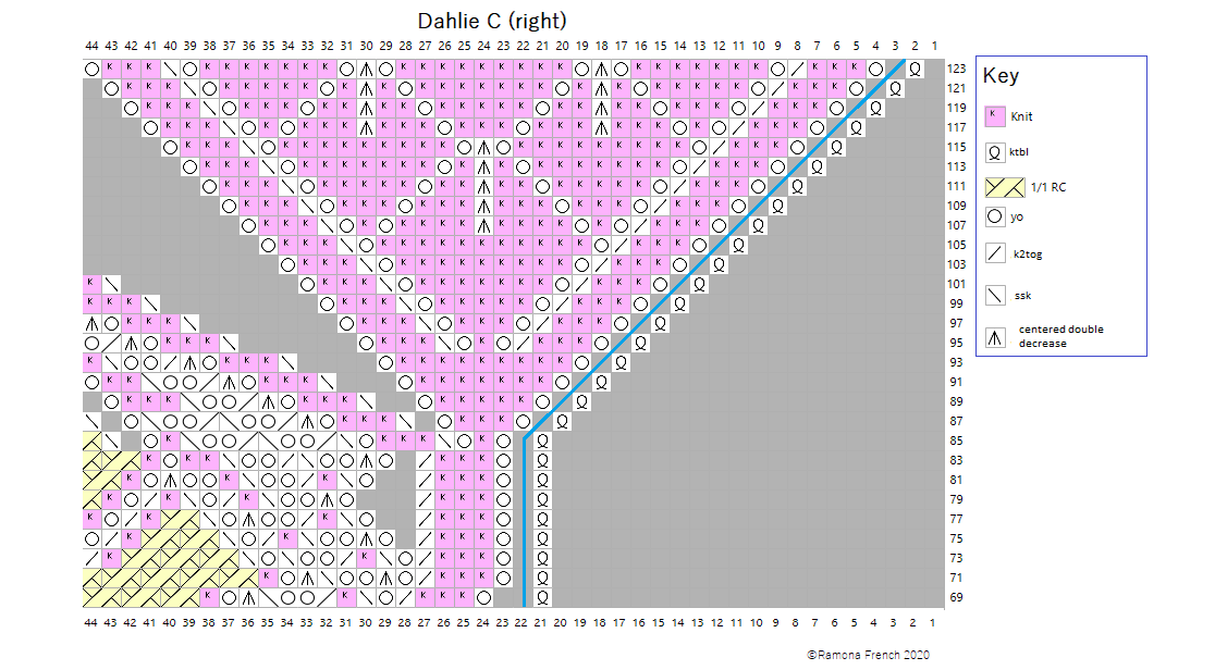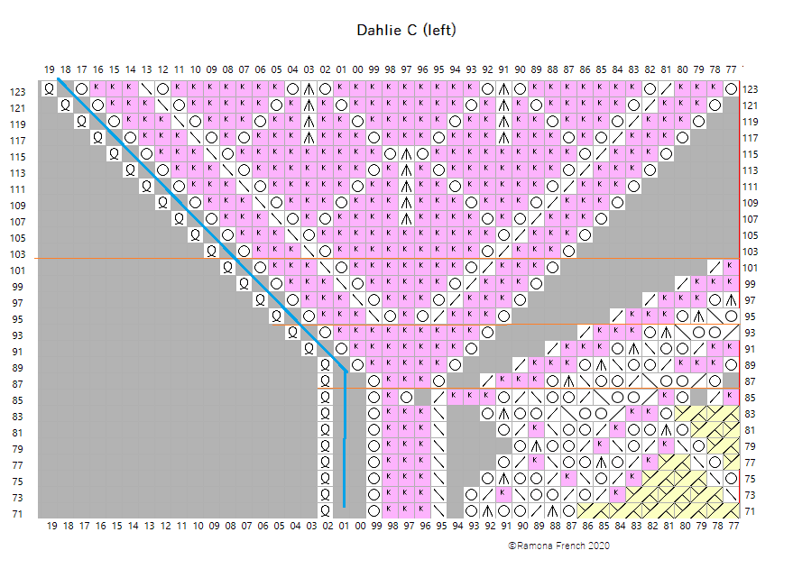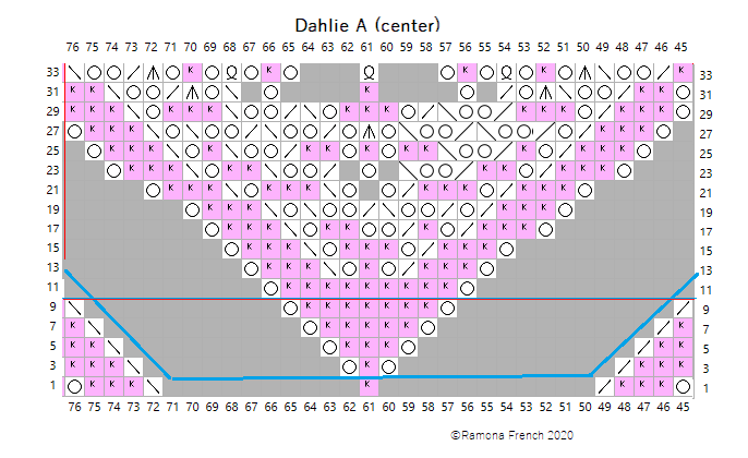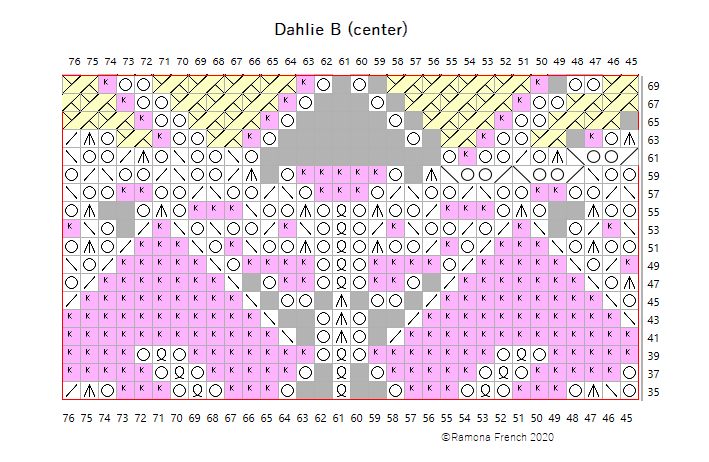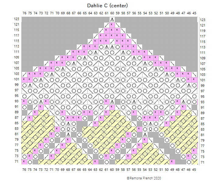 The chart is large, so I divided it into 9 sections. It's probably easiest to print out all the charts, trim them and tape them together. Knit the A sections first (right, center, left). Then knit the B sections. Finish with the C sections.