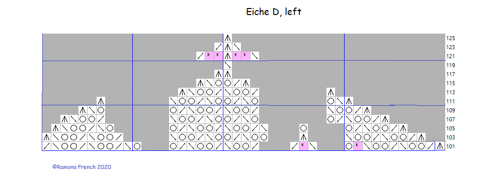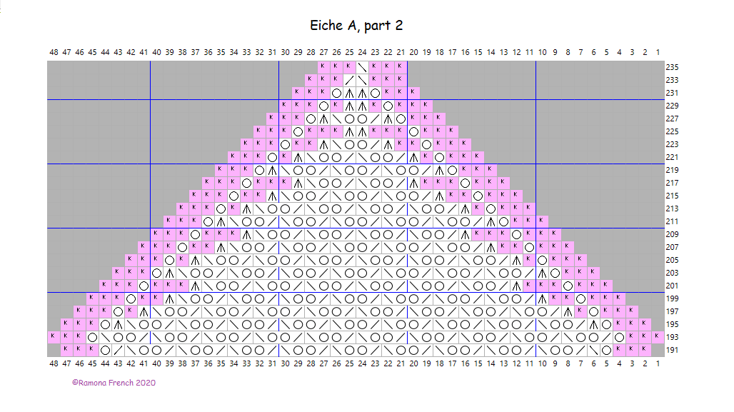 Published in Lavori Artistici a Calza 5, designed by Herbert Niebling. There is also a round version published in other sources, with the same leaves, also designed by Herbert Niebling. 65 cm x 100 cm. The oval pattern from Lavori consists of two parts: the central unit knitted flat, and the border/edging knitted in the round. You can see a photo here