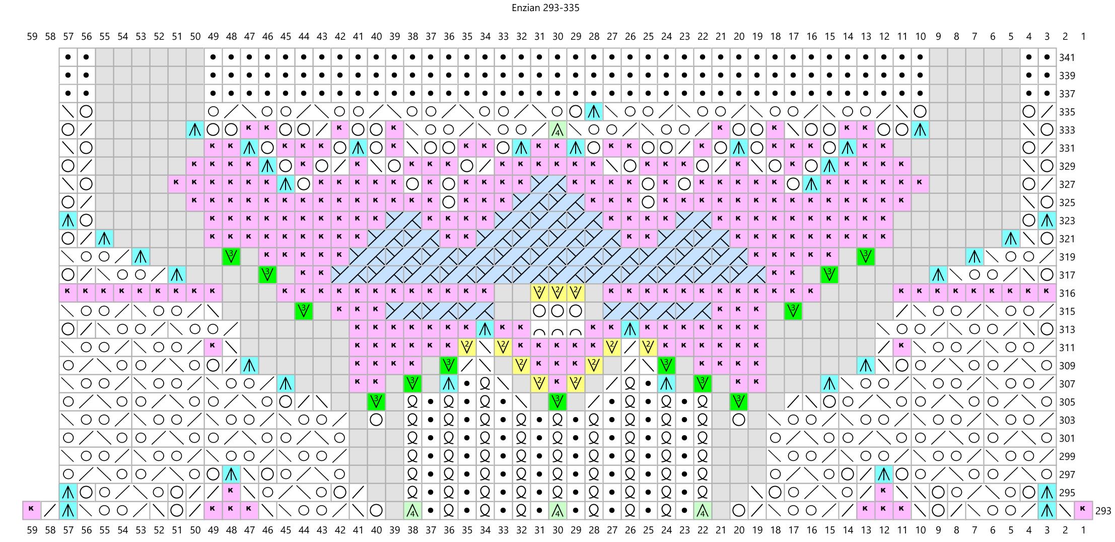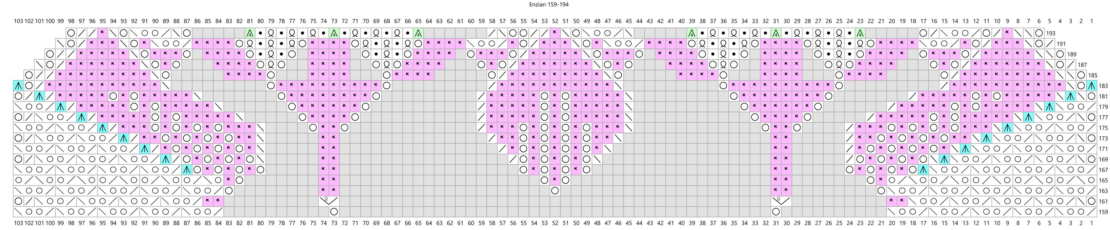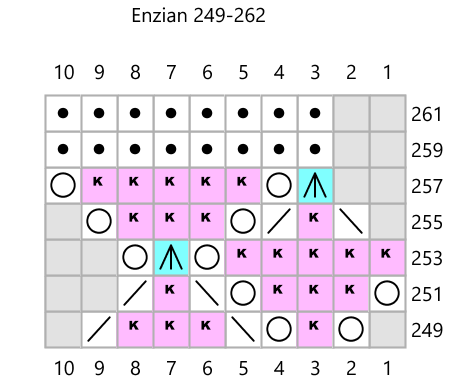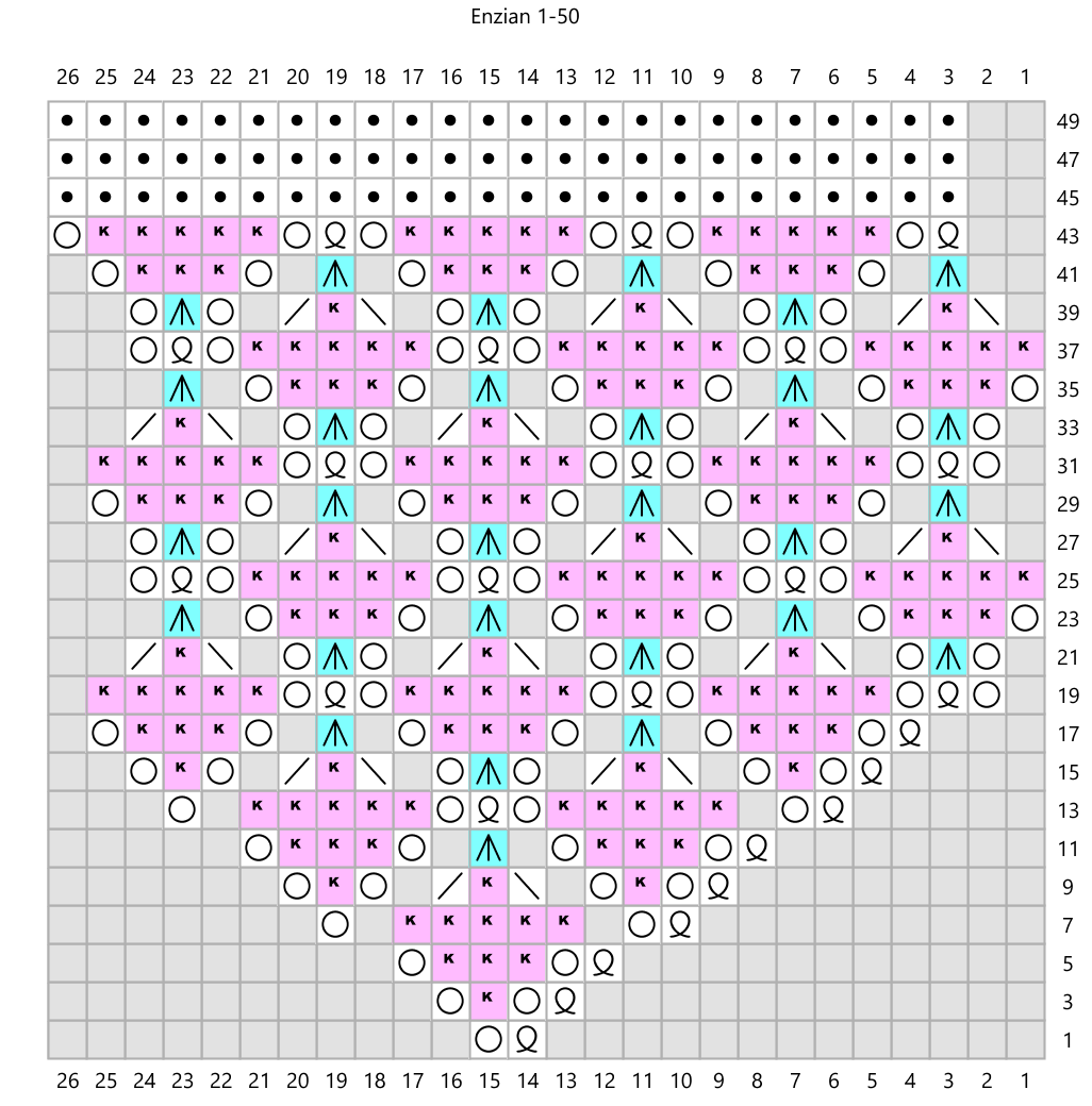 Cast on 8 stitches, join into a rond and repeat the pattern 8 times per round. Purl the rounds not shown on the chart. Note that the triple yarnovers in rounds 115, 219 and 315 should be increased to six stitches in the following rounds as shown in the charts. In rounds 145 to 153, repeat the pattern 80 times per round. Then purl 5 rounds and knit the next pattern (from round 159) 16 times per round to create the second stripe of flowers. In rounds 249 to 257 repeat the pattern 160 times per round to make the second stripe of diamonds. From round 263 knit the final pattern 32 times per round to create the last round of flowers. After the last purl round, decrease with a crochet hook. Decrease 4 stitches together with one double crochet stitch and chain 12 stitches between the double crochets.