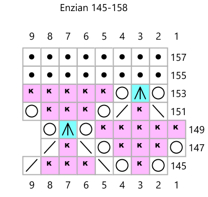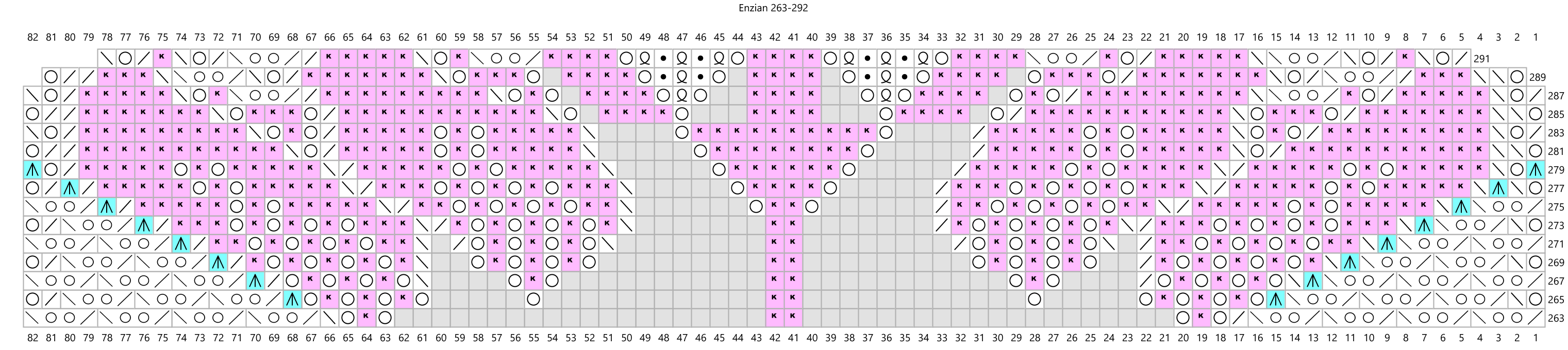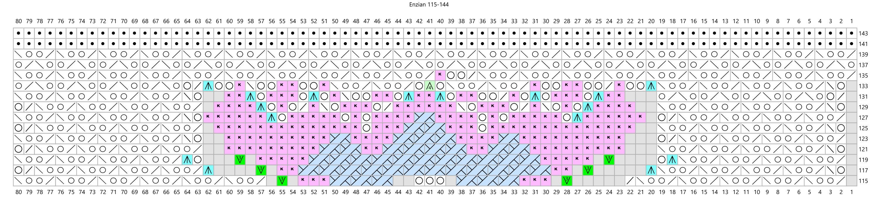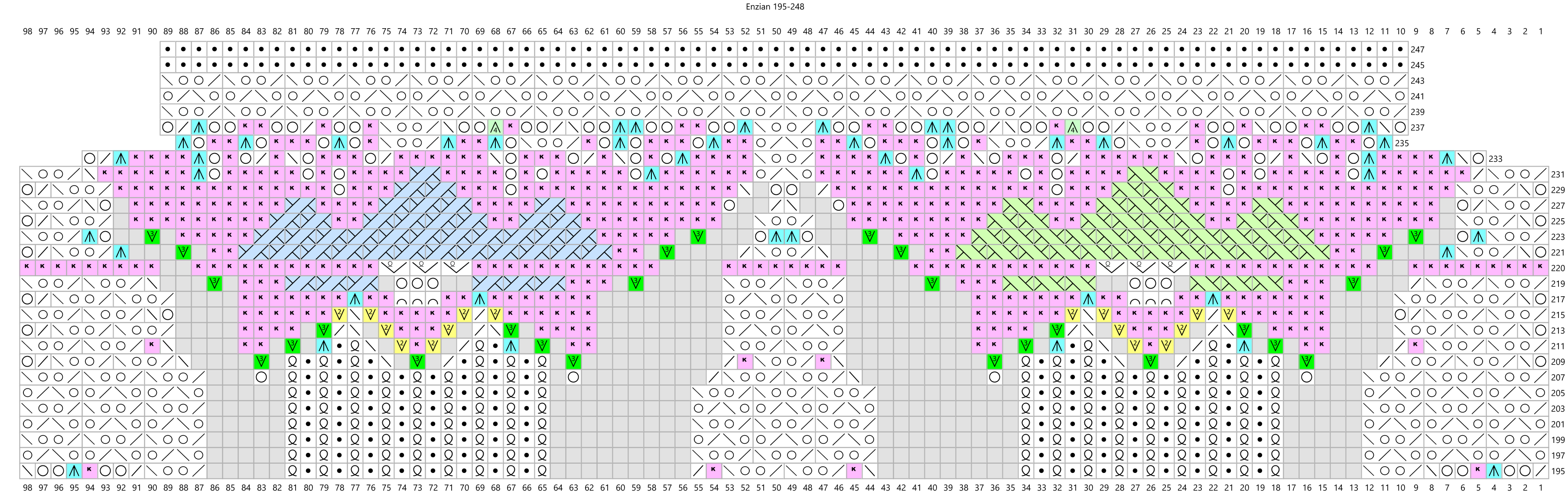 Cast on 8 stitches, join into a rond and repeat the pattern 8 times per round. Purl the rounds not shown on the chart. Note that the triple yarnovers in rounds 115, 219 and 315 should be increased to six stitches in the following rounds as shown in the charts. In rounds 145 to 153, repeat the pattern 80 times per round. Then purl 5 rounds and knit the next pattern (from round 159) 16 times per round to create the second stripe of flowers. In rounds 249 to 257 repeat the pattern 160 times per round to make the second stripe of diamonds. From round 263 knit the final pattern 32 times per round to create the last round of flowers. After the last purl round, decrease with a crochet hook. Decrease 4 stitches together with one double crochet stitch and chain 12 stitches between the double crochets.