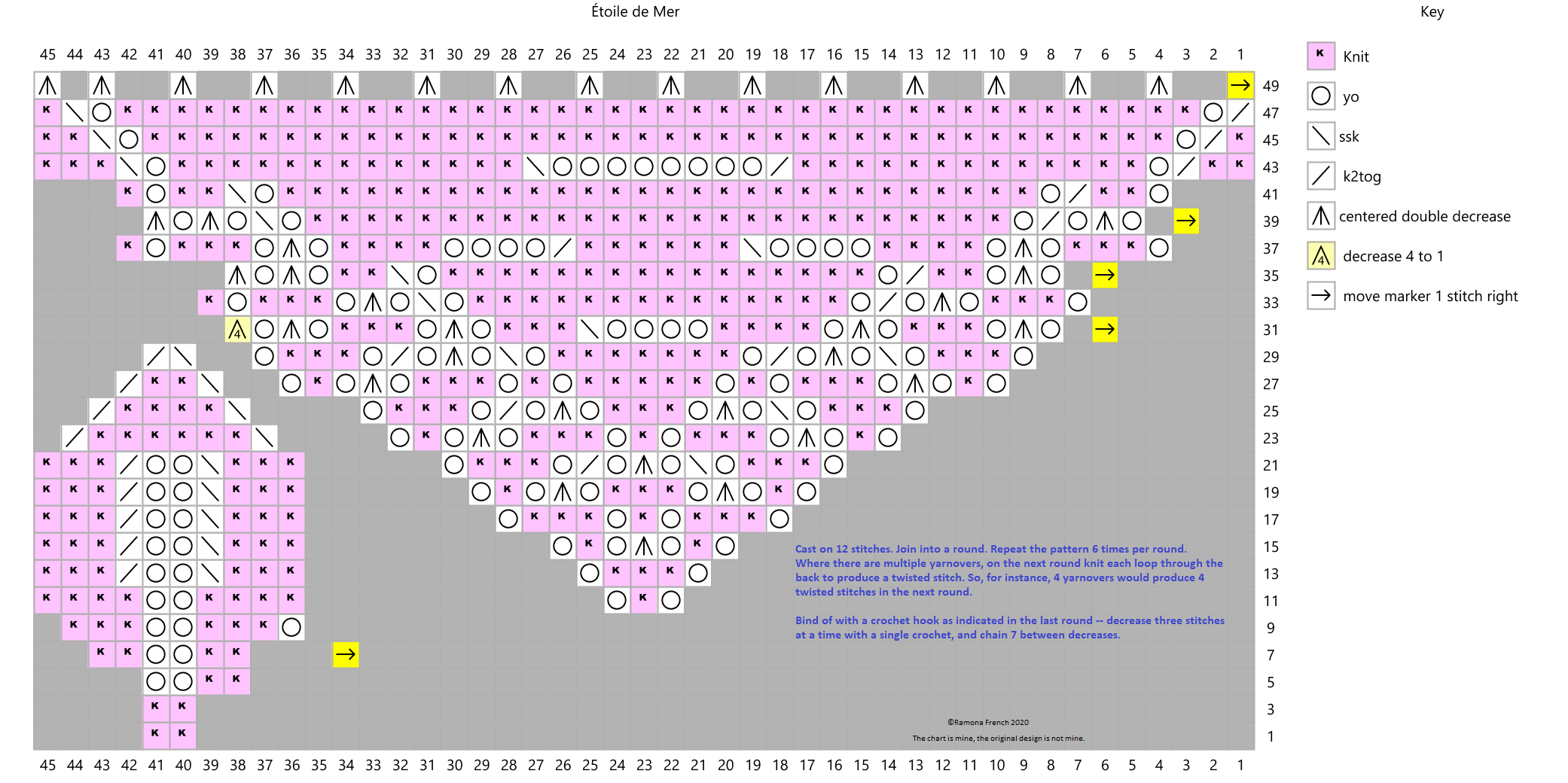 This is quite a pretty little starfish pattern. Instructions are on the chart. Size varies depending on the size of thread/yarn and needles used, of course. It is from an early Le Tricot d'Art and I don't know who the designer was.