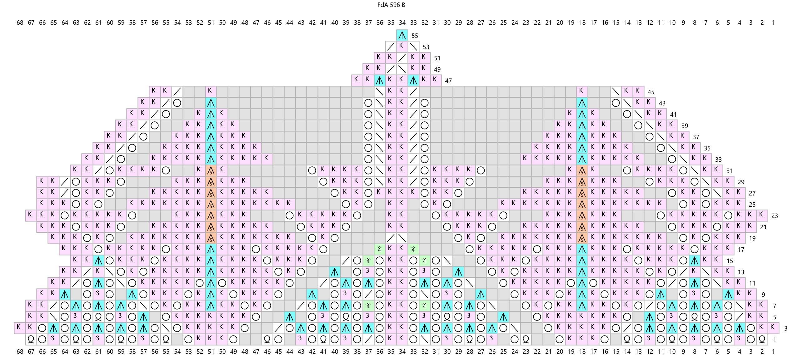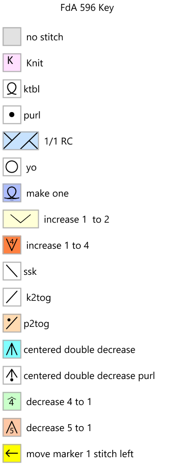 NOTE: Raveler Majkaz has discovered some howling errors in some of my charts, including these. In chart A there is an error in the original chart. We know it is an error because the knitted example is not knit according to chart A (see the photo on the FdA 596 pattern in Ravelry. Link above in title.) Majkaz figured out how to knit the pattern so that it looks like the photo, and once I looked at it, I could see what Majka meant. So Chart A on this page is recharted according to the original, and the alternate chart A is knitted according to Majkaz's work.