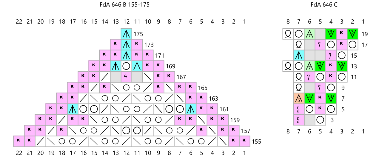 Instructions: Cast on 8 stitches or 2 stitches on each of the 4 needles and knit in the round with the 5th needle, according to diagram A. After the 54th round, place the first 24 stitches on a stitch holder or waste thread, the next 70 stitches remain on a needle and form the first side of the oval. Place the next 48 stitches on a stitch holder or waste thread, and leave the other 70 stitches also on a needle to form the 2nd part of the oval. Then place the last 24 stitches on hold with the first 24 stitches. Knit flat according to chart B over the first 70 stitches. Knit the odd rows according to the chart and purl the even rows (return rows which are not indicated on the chart). After the 175th row, place the remaining stitches on a safety pin. Repeat on the second set of 70 stitches to form the other end/point of the oval.