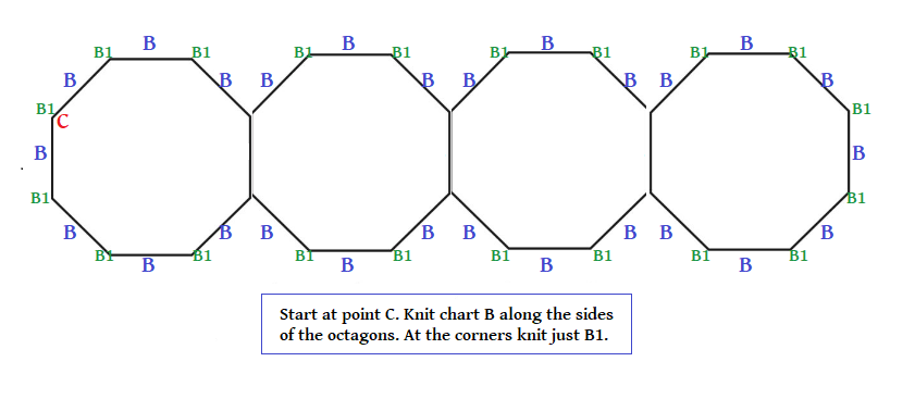 Execution: Cast on 8 stitches and join into a round. Knit according to chart A. Repeat the pattern 8 times per round. In the rounds not shown on the charts, knit the knits and purl the purls. Read the diagram from right to left and from bottom to top. Empty compartments are unimportant and help to show the design. Purl rounds 14 to 16. In the 18th and 40th rounds, knit 9 knit stitches from each group of 3 yarn overs, i.e. alternately knit 1 time and purl 1 time until you have 9 stitches. After round 118, leave the live stitches on hold. Knit 3 more octagons in the same way. Sew one side of an octagon (48 stitches) to one side of another octagon (see schematic.) 1248 stitches remain. Start chart B at point C of the schematic. This is therefore the beginning of 48 stitches on one side of an octagon. The following rounds consist of 2 parts, the 1st part (B) is before the bold line and the 2nd part (B1) is after the bold line. These 2 parts are repeated as follows: B, B1, B, B1, B, B1 2 times following B, then Bl, B, Bl, 2 times following B, then B1, B, B1, 2 times following next B, then B1, B, B1, B, B1. Repeat from the beginning once more for the 2nd side of the doily.