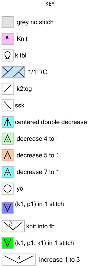 Cast on 8 stitches and join into a round. Knit the pattern 8 times per round up to round 182. Knit the pattern 16 times in each round from 83 to 276. Starting at round 277 repeat the pattern 32 times per round. Bind off with a crochet hook, making each decrease with a single crochet as shown in the last round. Chain 13 between the decreases.