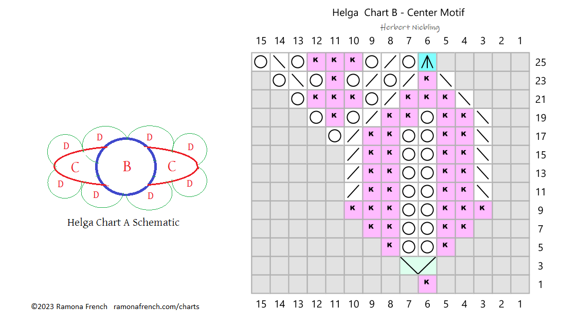 Cast on 8 stitches, and close into a round. Follow Chart B (center motif), repeating the pattern 8 times in the round. Knit the unnumbered rounds, and where there are two YOs, on the following round knit the first loop and purl the second loop.