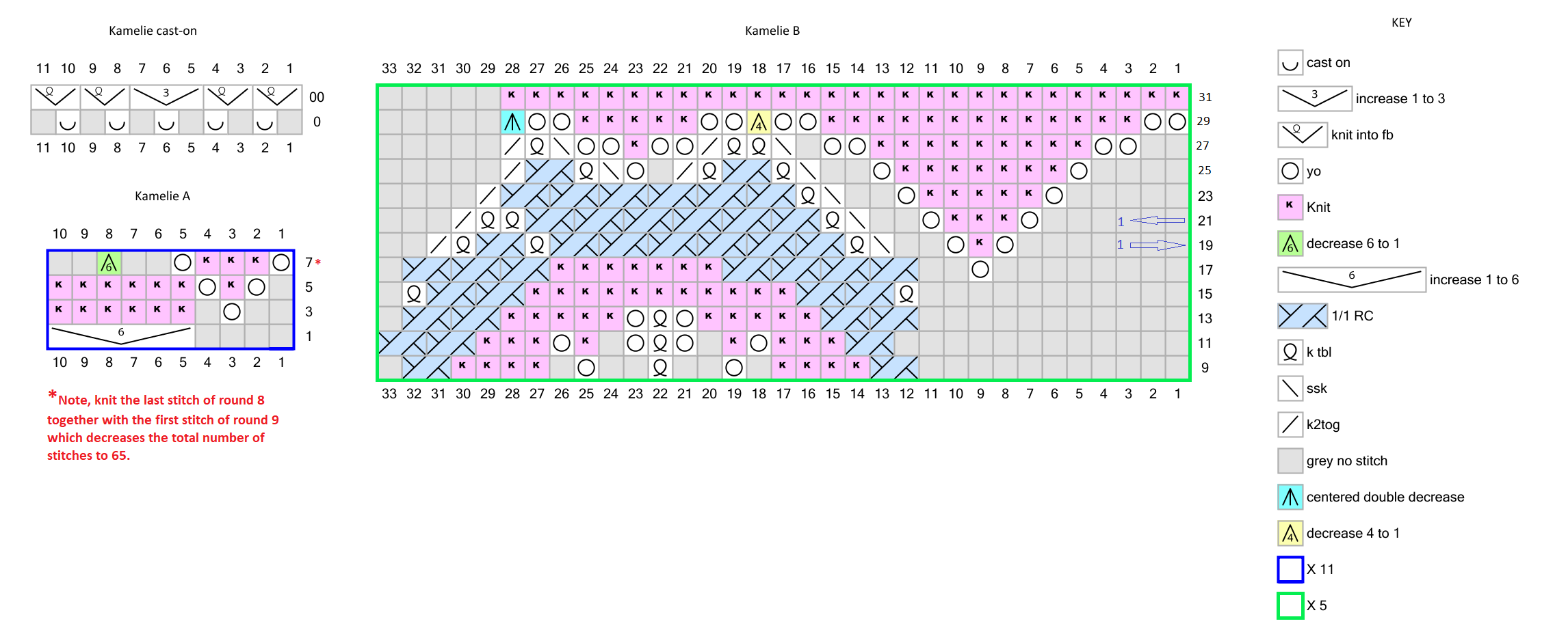 Instructions: Cast on five stitches and join into a round. In the next round increase the 5 stitches to a total of 11 stitches, as shown in the "cast on chart." Then follow chart A, repeating the pattern 11 times per round. Knit the last stitch of round 8 together with the first stitch of round 9, which moves the start of the round one stitch left, and makes a total of 65 stitches.