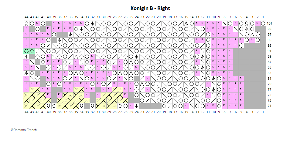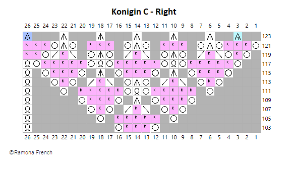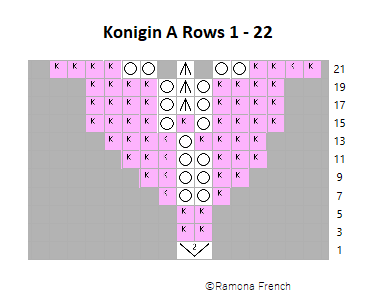 Konigin is a design by Herbert Niebling, originally published in Beyer 361. It has eight repeats in the round. I have found online another pattern, "Les Pivoines," published in Le Tricot d'Art (album number unknown), which is the same pattern but with only six repeats. If anyone out there knows the album number, please let me know!