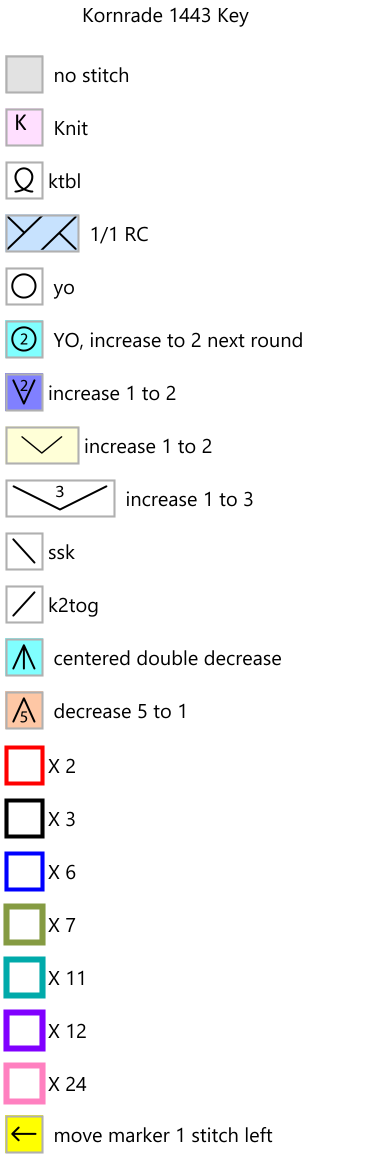 Square tablecloth, approximately 102 cm x 102 cm. Materials: 350g of size 10 crochet thread, size 2.5 knitting needles and size 1.25 crochet hook. This was a difficult one to rechart, and so it might be a difficult one to knit. Let me know, please, if you find any errors! In many places certain stitches are repeated to form a motif, and those repeats are outlined in boxes of different colors. The key to the colors is on each chart. However, in a couple of places that just didn't work well, so instead I have outlined groups of stitches in gray and I have given the repeat for each row next to the stitches inside the gray outline. I hope that makes sense.