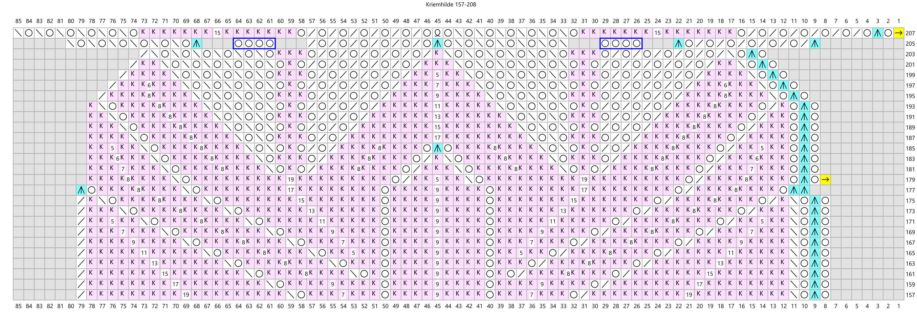 Cast on 10 stitches and join into a round. Knit according to the charts, repeating the pattern 10 times per round up to round 101. Increase the 4 yarnovers in rounds 73 and 205 to 15 stitches in the following rounds (rounds 74 and 206.)