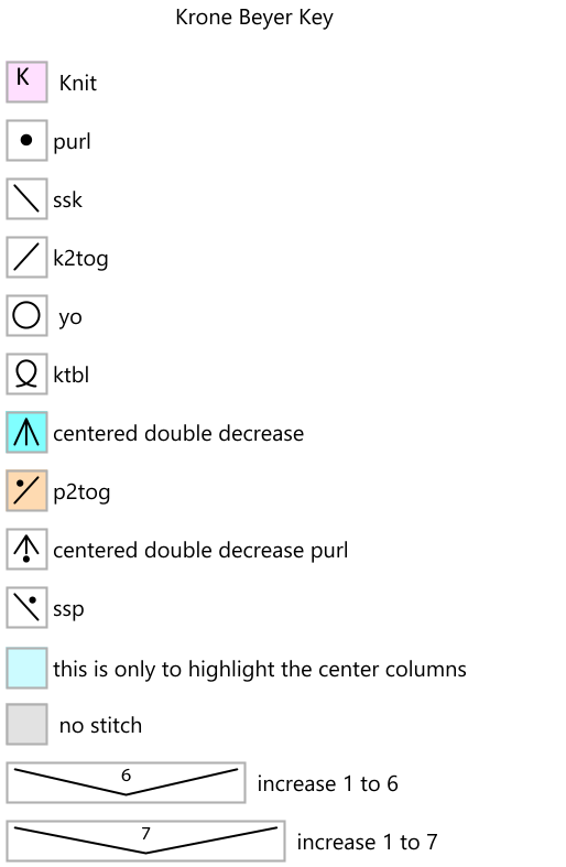 Krone is a lovely lace edging, rather elaborate, published in a Beyer magazine in 1957. I recharted it, correcting a couple of problems, and using more modern knitting symbols. I don't own the original pattern, but this rechart is my own. If you knit this lace, please post it in your projects on Ravelry and link to this page. I'd love to see your work! If you'd like to see what it looks like, there is a photo here on the Ravelry page for this pattern.