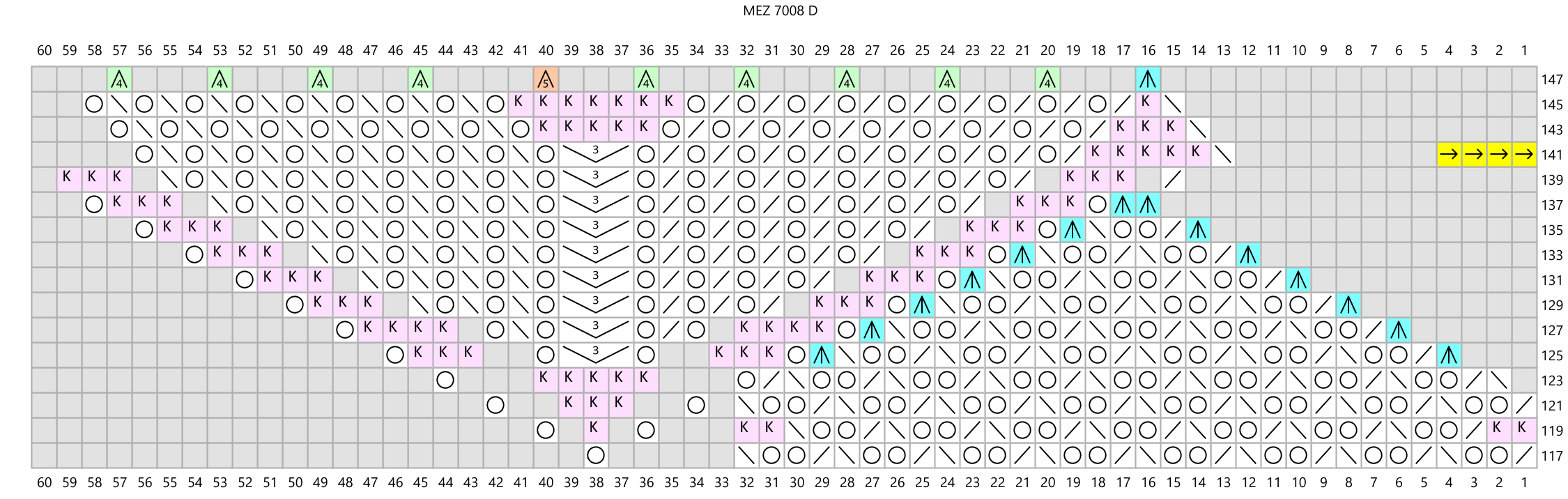 Cast on 6 stitches and join into a round. Knit one round and then begin following the charts. I broke up the single large chart into four smaller charts, much easier to follow. I've highlighted some stitches in color, so I don't miss them when I'm knitting. I hope it helps you, the way it helps me to pay attention to what I'm doing.