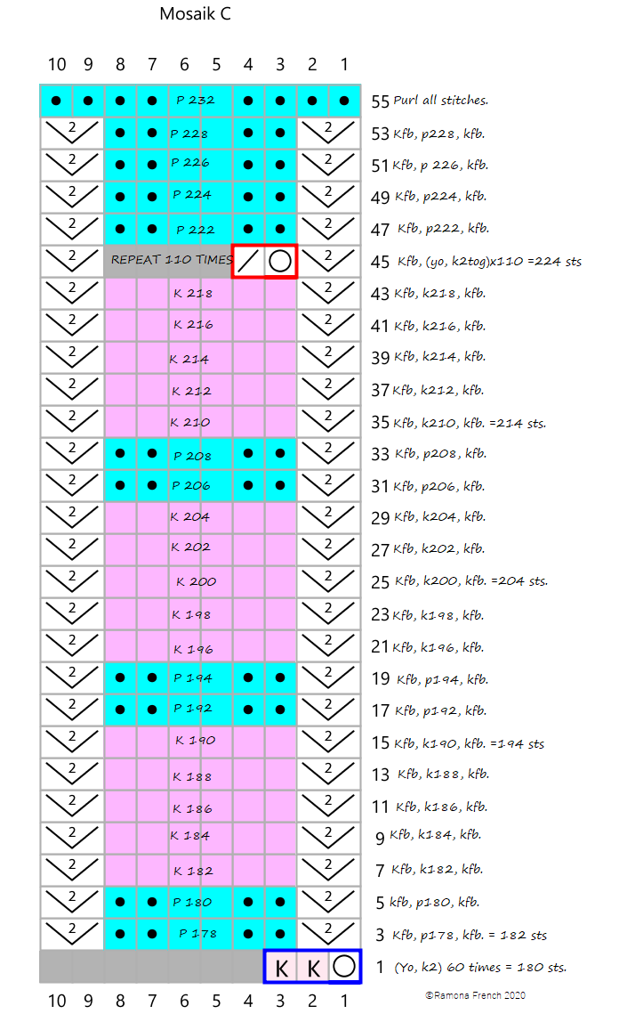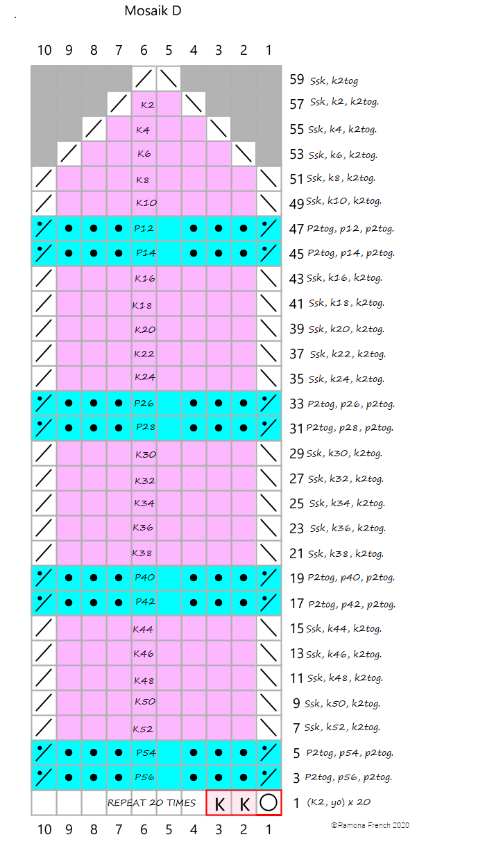 In Charts C and D, rather than have long rows of knit or purl, I have shortened the rows and just put in the number of knits or purls needed per repeat in the center of the column. If that is too confusing I have also written out the instructions for each round to the right of each chart.