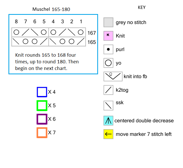 Cast on 12 stitches and join into a round. Repeat the pattern 12 times per round up to round 164. Repeat rounds 165 to 180 ninety-six times around. Finish as shown in the remaining charts. Be sure to pay attention to the repeats in each chart. Bind off with a crochet hook as shown in the last round. Block fiercely.