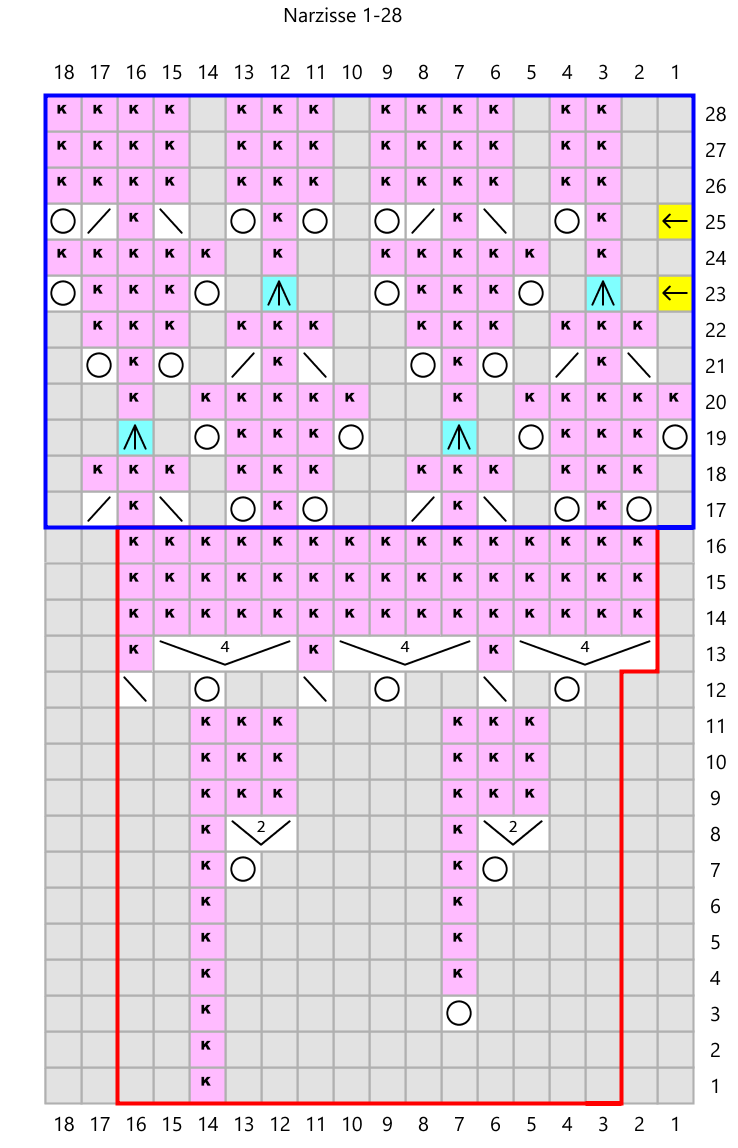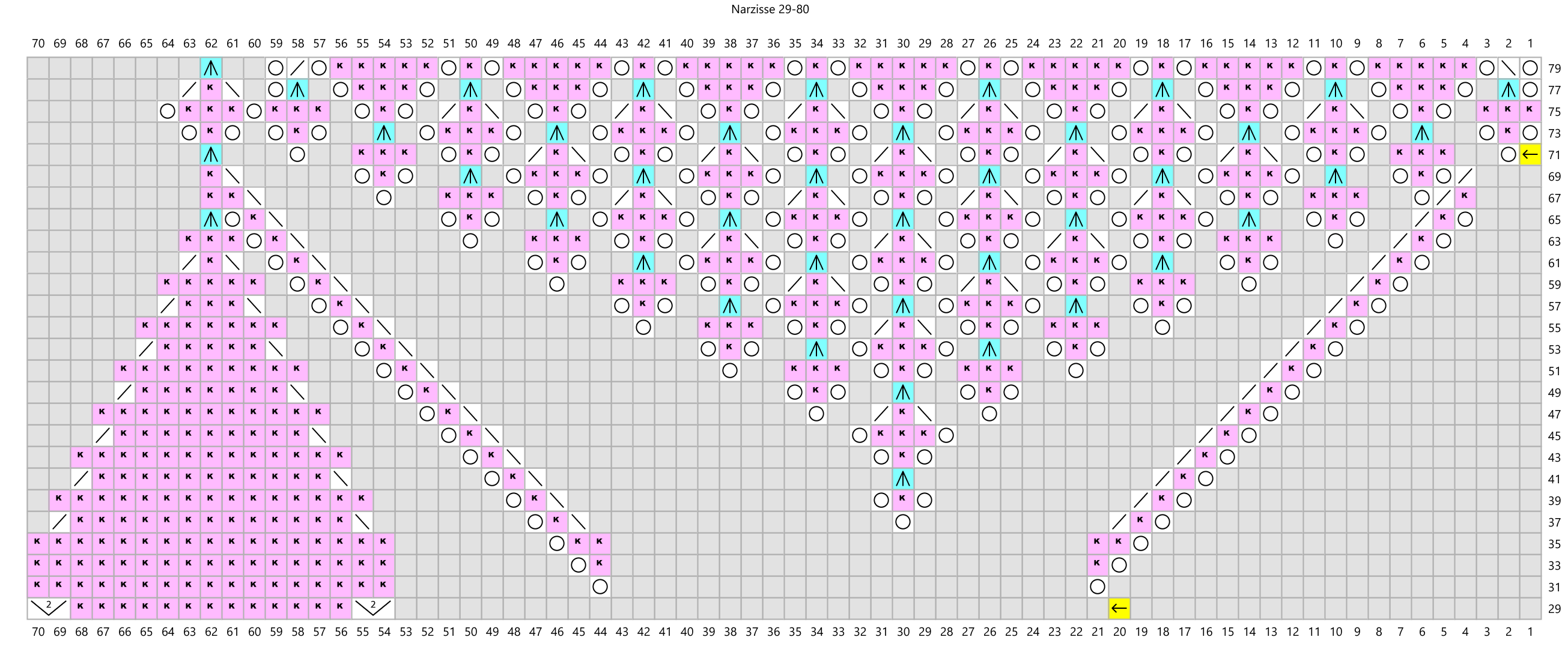 Cast on 8 stitches, join into a round and knit according to the chart. All intermediate rounds except round 12 are knitted. Up to round 16, repeat the pattern 8 times per round. From rounds 17 to 28, repeat the pattern 10 times per round. From the 29th round on, repeat the pattern 8 times per round again. Where there is a double yarnover (round 31), in the next round purl the first loop and knit the second loop. After the 80th round bind off loosely and block.