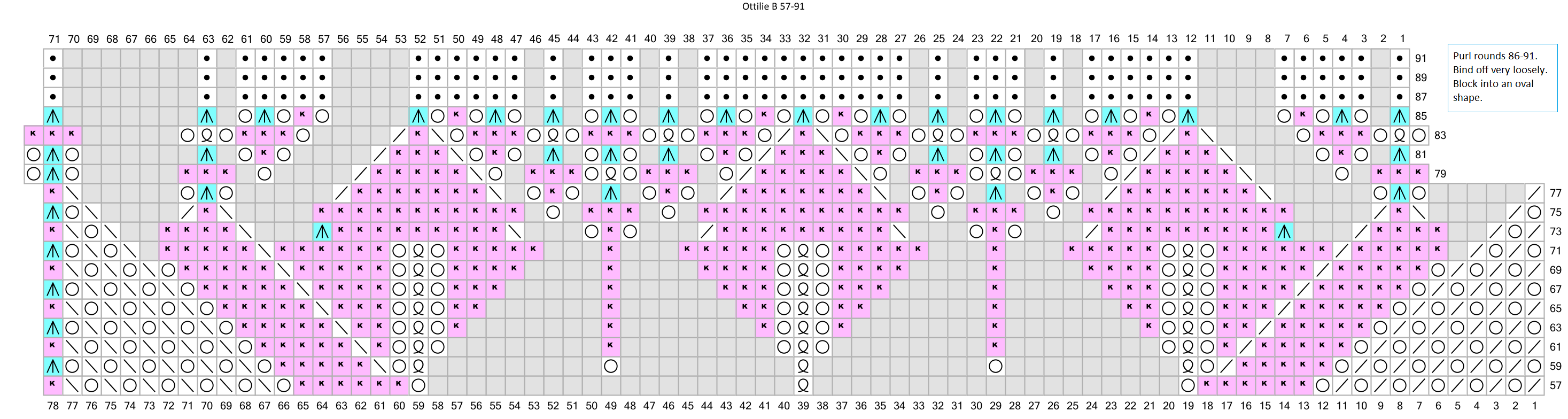 Ottilie is an oval doily, 85 cm long and 70 cm wide. The original pattern calls for 50 g medium weight ivory crochet thread and size 2 aluminum needles. The instructions are on the charts. Knit the center first, flat, then pick up stitches around the outside and knit the border in the round.