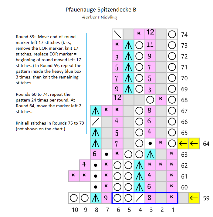 Up to round 58 repeat the pattern six times per round. At the beginning of round 59, remove the end-of-round marker, knit 17 stitches, and then replace the EOR marker. Begin the next chart at this point. After round 210 use a crochet hook to bind off. Use a single crochet to make the decreases indicated in the last round. Chain 12 stitches after every single crochet/decrease. Block evenly, using spray starch if necessary.