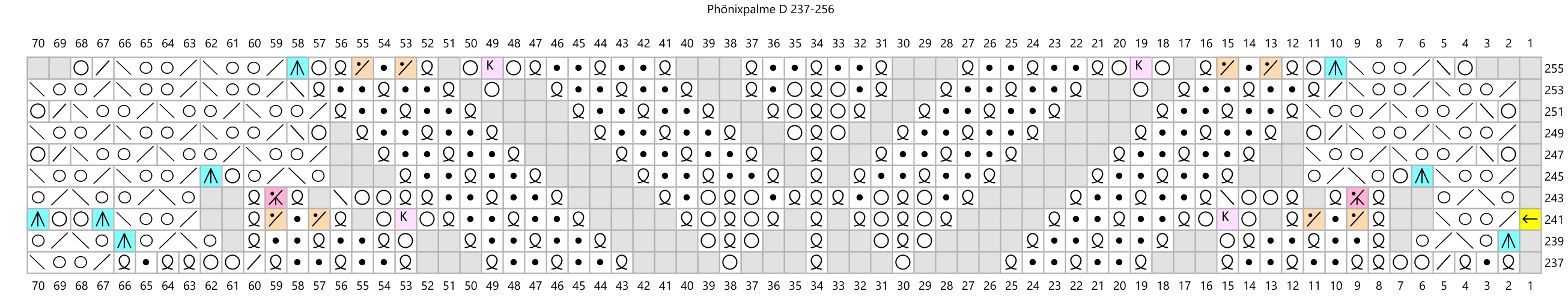 Cast on 16 stitches, join into a round and work according to charts A through D. Repeat the pattern 8 times per round. From round 237 on repeat the pattern 24 times per round, and from round 287, repeat the pattern 48 times per round. Note that in Round 8 you must increase the 3 yarnovers of the previous round into 8 stitches, alternating knt and purl stitches. After round 300, in the last round, join groups of 4 or 5 stitches together with a single crochet stitch, and chain 10 stitches between the groups.