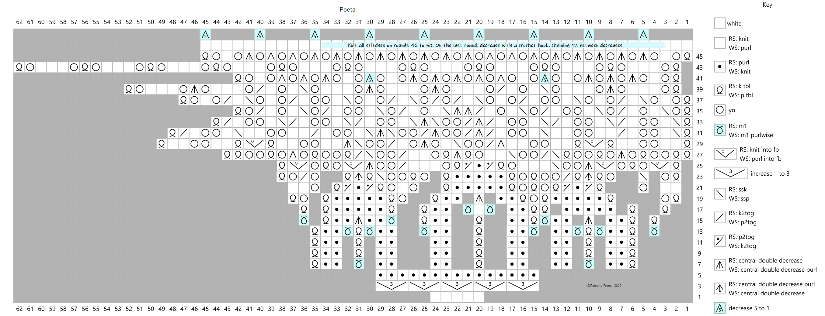 Material: 5 g glossy crochet yarn No. 60, knitting needles No. 1.25. Cast on 5 stitches and work according to the chart 5 times in the round. On the un-numbered rounds knit the knits and purl the purls. Where there are two YOs side by side, knit the first loop and purl the second loop. Knit all stitches on rounds 46 to 50. After the 50th round decrease 5 stitches at a time with a crochet hook, and chain 12 between the decreases. Note: Right-click on each chart and choose "view image" or whatever choice your browser offers, to see a larger image.