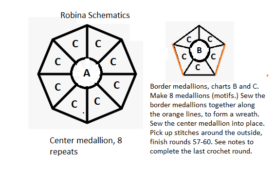 Border medallions: Cast on 5 sts for each medallion and join into a round. Repeat Chart B 5 times per round. After round 20, begin chart C. Repeat Chart C 5 times per round, as well. After round 56, place all stitches on scrap thread or a circular needle.