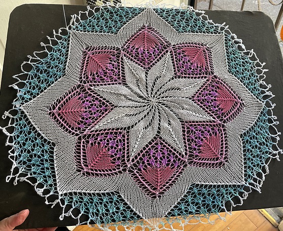 I don't know who designed this particularly pretty doily; if you recognize it let me know, please! It has a floral center and a wide border of arches like the ogives of a classic rose window. A very kind Raveler, Roisnoir, has shared a photo of her version, which I've inserted below. The descriptions says that the doily is 65 cm in diameter, and requires 50 g of size 4 crochet cotton, size 3.5 mm knitting needles and size 2 crochet hook. The doily will be smaller, of course, if you use smaller thread and knitting needles. If you decide to knit the doily, and you are feeling kind-hearted, please share a photo I can post here for others to see.