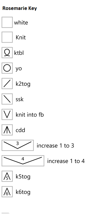 Rosemarie is the name of a Herbert Niebling pattern first published in Beyer Band, 288: Kunststricken: Grosse und kleine Decken, Spitzen und Einsätze in 1934. I struggled with the pattern, and finally had to rechart it. In doing so, I found a couple of mistakes that threw the pattern and the stitch count off. So the chart shown in this document is my revised chart, using slightly more modern stitch symbols. I used the program Stitch Mastery to rechart the pattern. I also rewrote the instructions so that they make sense to me. I hope you find this useful!