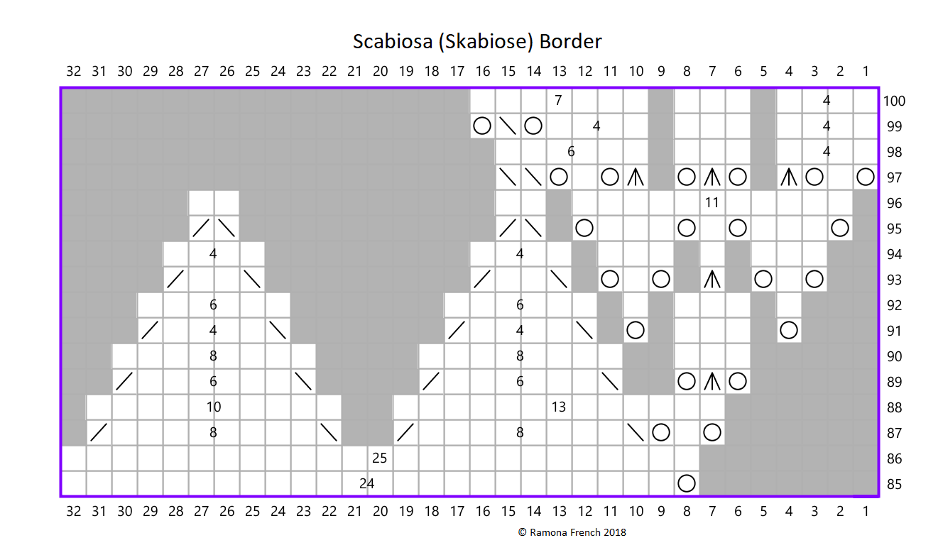 Cast on 8 stitches and join them in a round. Follow the first chart, repeating the pattern 8 times in the round. Repeat the border 16 times per round.