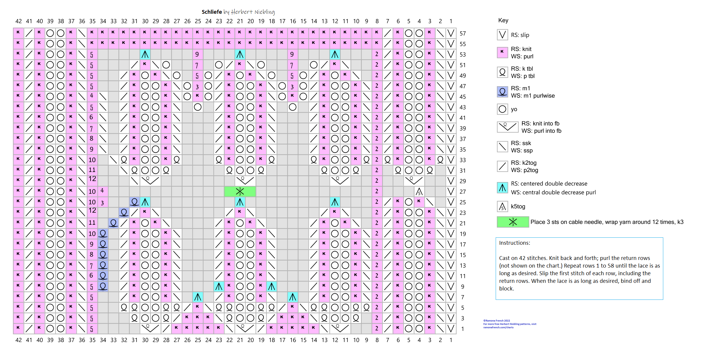 Lace with scalloped edge: Each repeat has 58 rows. Begin by casting on 42 stitches and start at row one on the chart. Purl the even-numbered rows. Depending on how you plan to use the lace, I would either start with a provisional cast-on, or knit a few rows of garter stitch before beginning the chart. When the lace is as long as you want it, either graft the ends together (for a pillow case edging, maybe) or knit a few more rows of garter stitch and bind off.