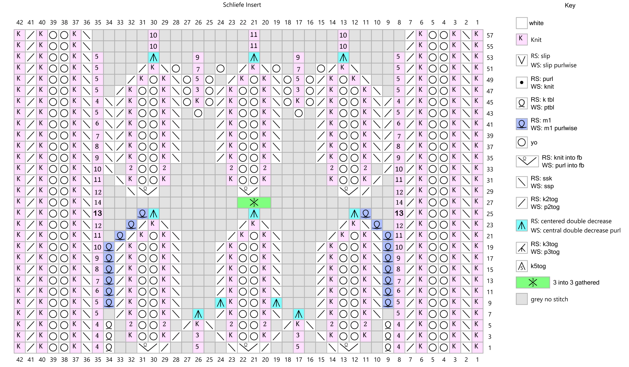 NOTE the gathered stitch on row 27. Slip three stitches onto a cable needle and hold to the front of your work. Wrap your yarn or thread tightly around the three stitches a dozen times. Then knit the three stitches. You could also, I suppose, pull the three stitches through a bead with a large enough hole in the center. The primary thing is to make some sort of bump, and to start and wind up with three stitches in that spot.