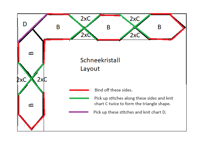 Cast on 6 stitches and join in the round. Work according to chart B, repeating the chart 6 times per round. Knit all rounds which are not charted. After rd 60, bind off the stitches of 2 opposite edges, keeping the other stitches live on the needle.