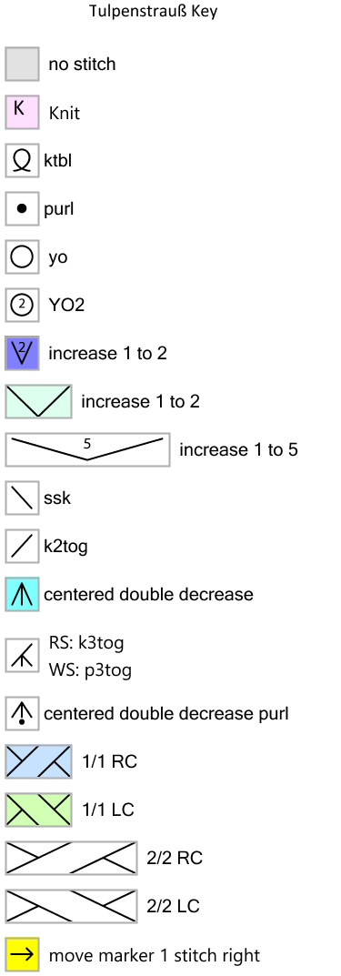 Cast on 8 stitches, join into a round and knit the pattern according to the charts 8 times per round. Knit rounds 101 to 106, which are not shown on the chart. From round 107, repeat the pattern 16 times per round. After round 130, bind off with a crochet hook. Crochet 3 stitches together with a single crochet, and chain 10 stitches after each single crochet. Many thanks to Nandalee from Ravelry who pointed out some errors, which have been fixed, new charts uploaded.