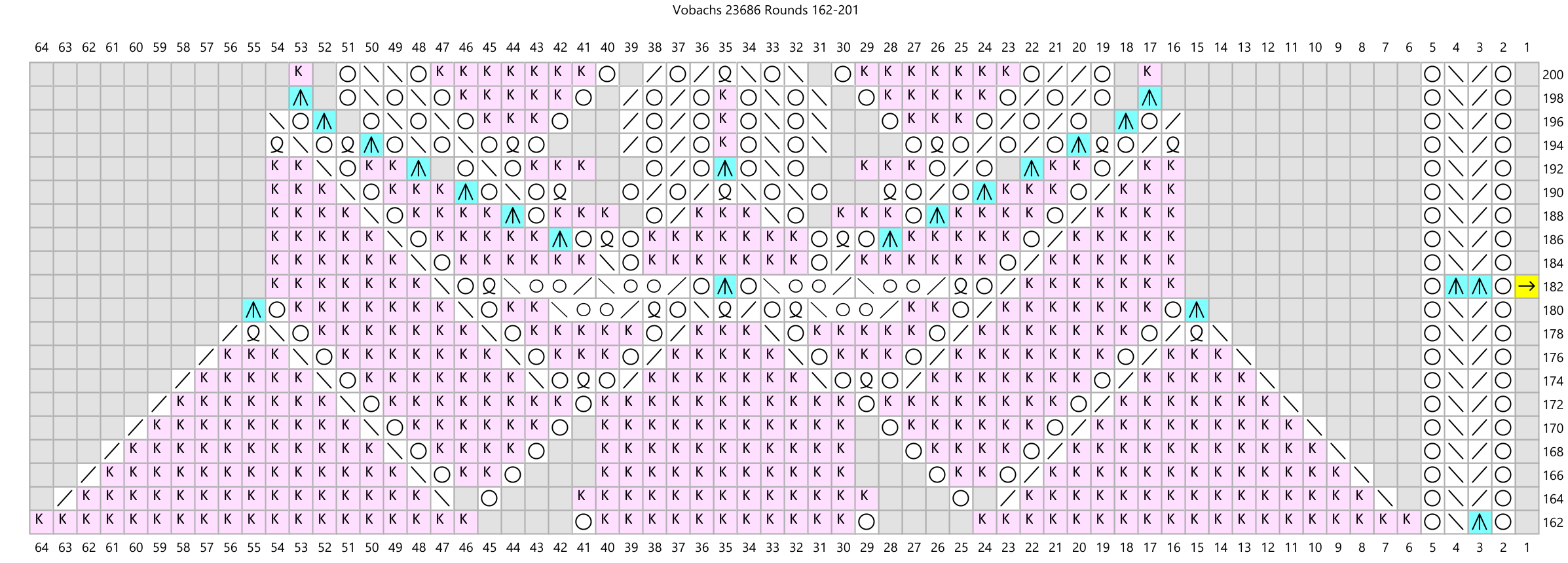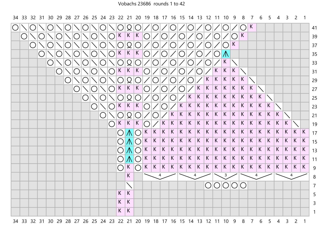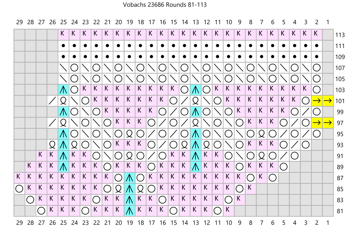 Update 6/22/2024: Well, my original effort at recharting this pattern was full of errors. A wonderful Niebling expert on Ravelry knitted the pattern using my charts, comparing them to the originally published charts in Vobachs. She sent me a long list of errors! I am so glad -- I just love receiving feedback like this. It took me a while but I have fixed all the errors (that I know of) and the new charts are shown below. If you knitted this pattern before this update, I apologize for the frustration you must have felt.