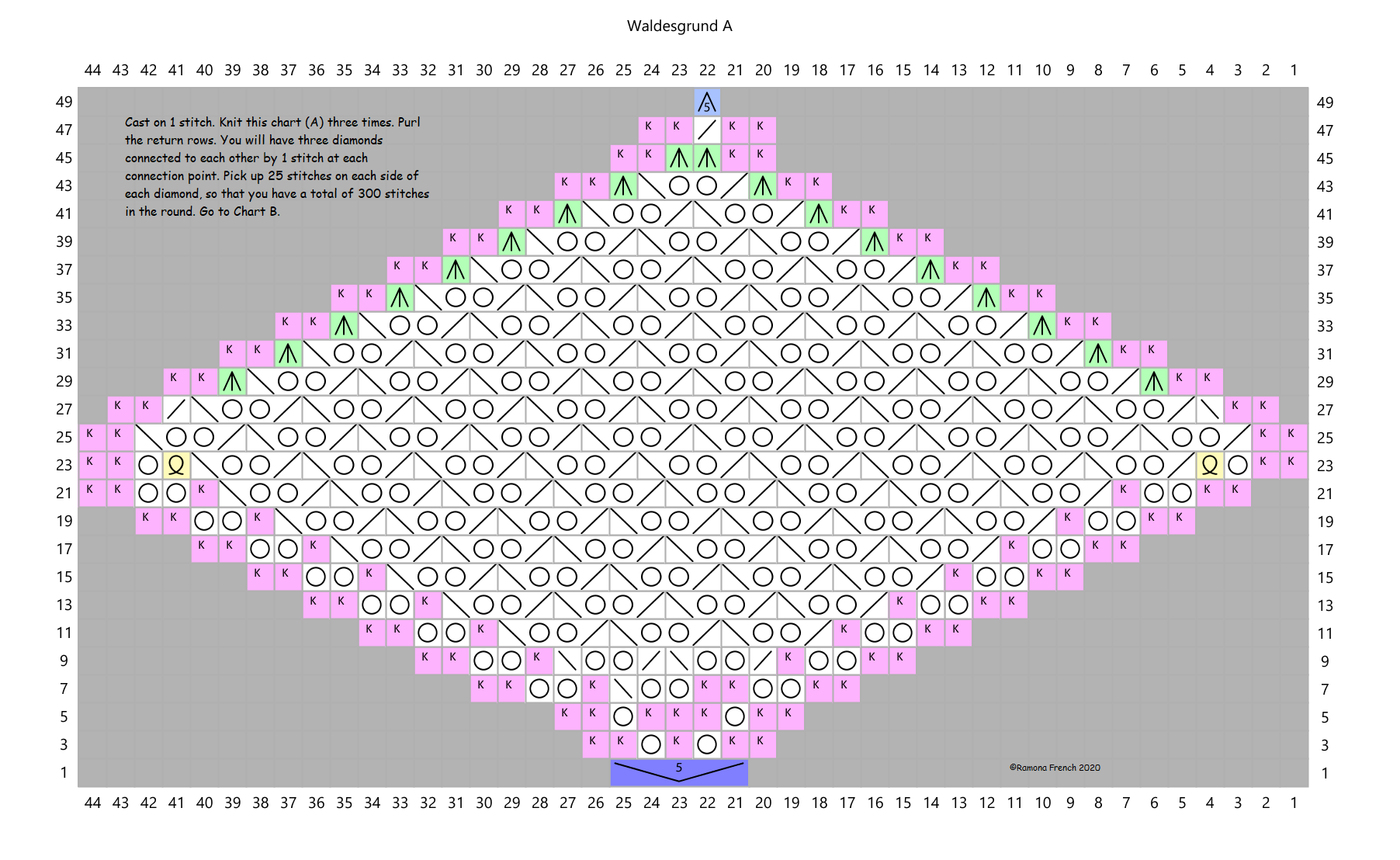 Cast on 1 stitch and begin chart A by increasing 1 stitch to 5 (row 1). Knitting back and forth, repeat rows 1 to 50 three times, purling the return rows. You will have three diamond shapes, connected to each other by one stitch. Pick up 25 stitches on each side of each diamond, so that you have 300 stitches in the round.