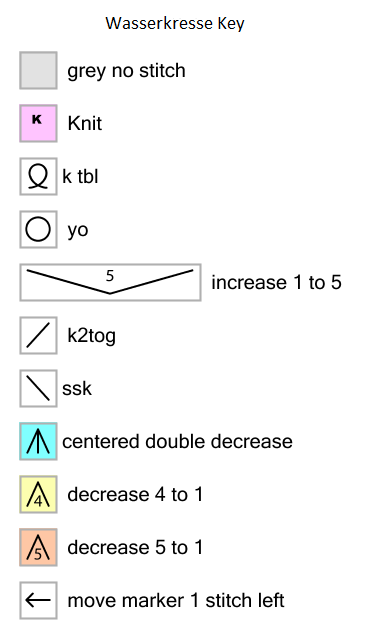 Cast on 8 stitches, join into a round and begin knitting according to the first chart (Wasserkresse 1-50). On even rounds which are not shown on the charts plus rounds 7 to 10, purl all stitches. Repeat the pattern 8 times per round. Work the second chart (Wasserkresse 51-89) 16 times per round. Move the stitch markers one stitch left on rounds 81, 85 and 89. In round 89 decrease as shown, using a crochet hook and a single crochet for each decrease. Chain 12 between decreases.